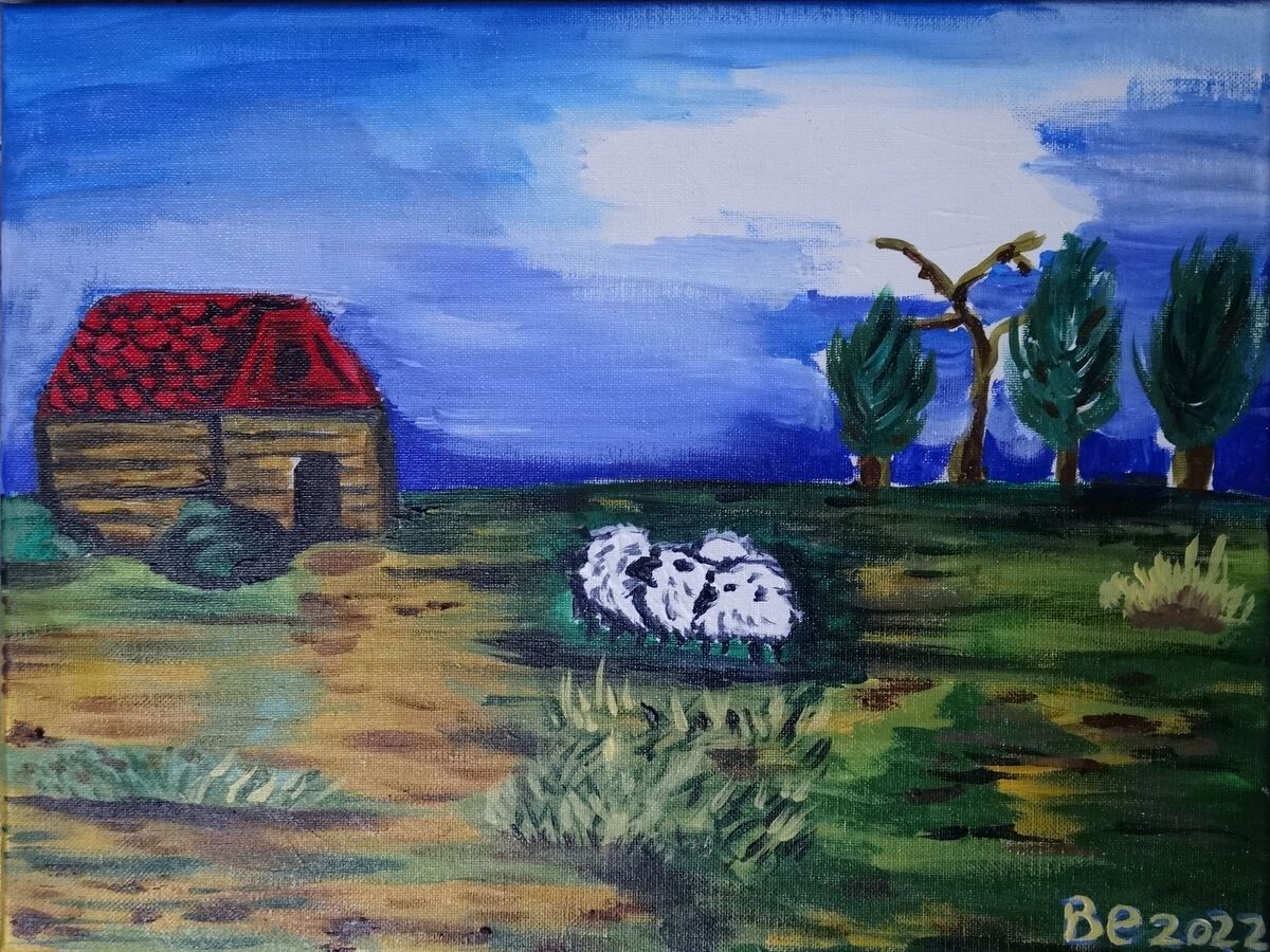 Un cuadro en acrílicos que representa un ejercicio personal: agarrar varios objetos/temas diferentes (árboles, animales, edificios), y construir un paisaje con ellos, de alguna forma algo naif y variando trazos de pinceladas.