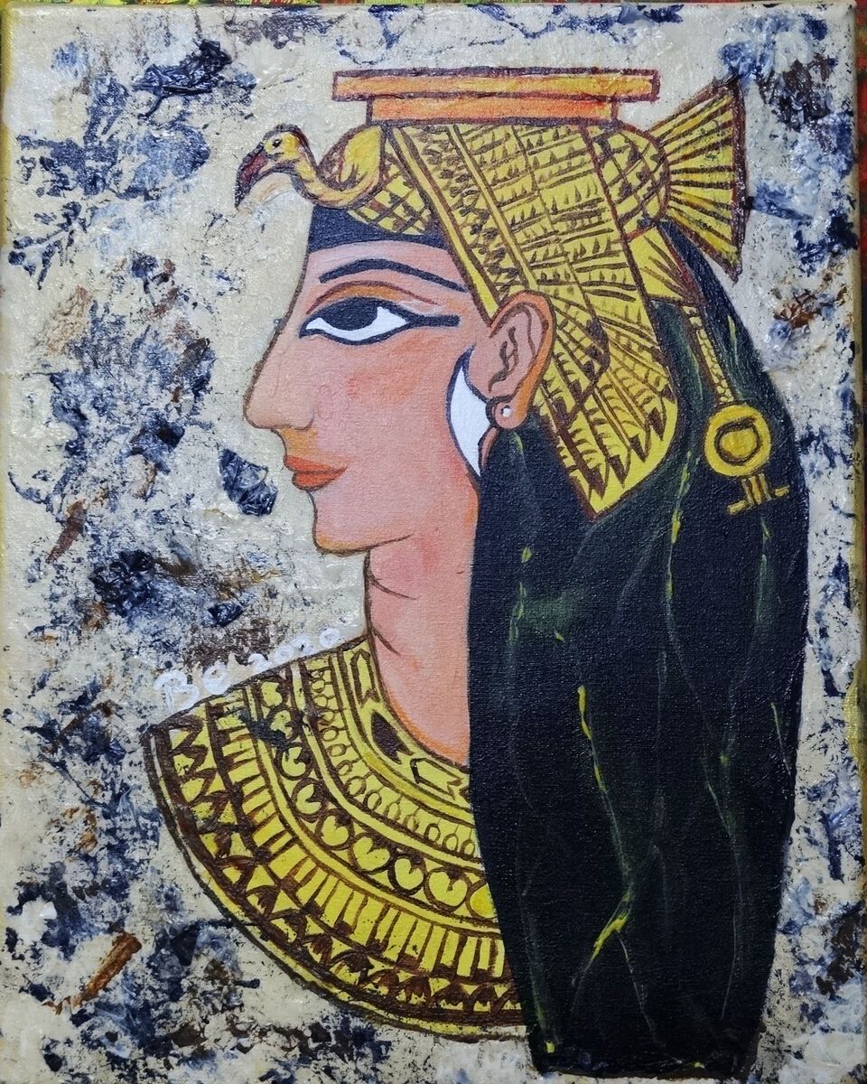 Una de mis primeras pinturas dedicadas al Antiguo Egipto. Desde joven sentí mucha atracción por esta civilización y época histórica. Curiosamente nunca represente algo, hasta este momento que me propuse a investigar otras formas de realizar texturas en los cuadros.