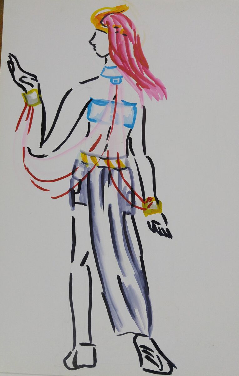 Esta ilustración realizada en marcadores pertenece a un curso de capacitación en ilustración de moda, dónde se ejercito el diseño, tematica y estilo propio. El proyecto trataba de tomar de referencia un personaje y crear una composición de prendas que tengan sus caracteristicas. En mi caso el planteo proviene del personaje Jinx de los comics DC, tanto la version antigua de una mujer tribal de piel morena y ropas blancas como la version moderna de una joven gotica de ciudad de cabello rosa. De una version fue tomada las prendas sueltas blancas, y de la otra version el cabello rosa.