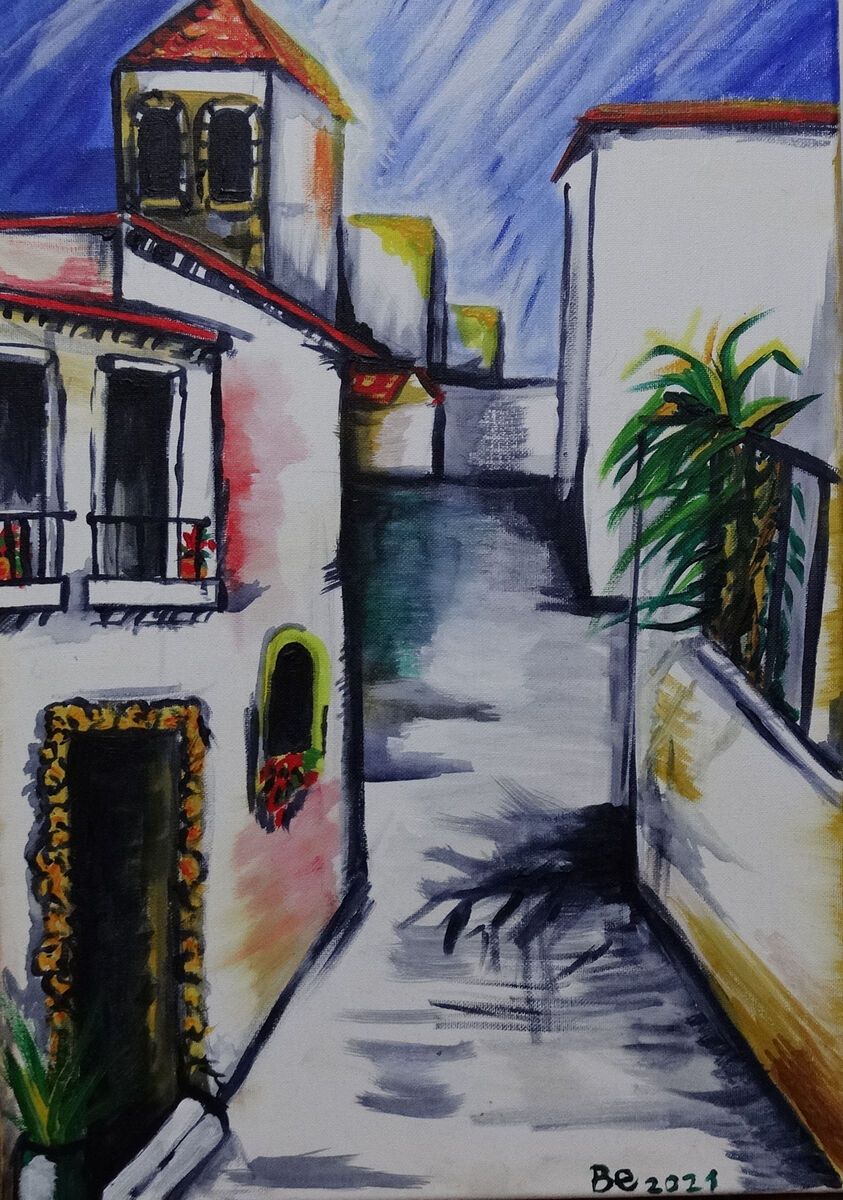 Un cuadro en pintura acrílica inspirado en las calles del pueblo Ubrique (España). Una pequeña representación de lo iluminado y llamativo que me resultan estos pueblos que conservan un aspecto bastante blanco en todas sus partes. Está es una primer experiencia tomando algunas características llamativas, paredes lisas blancas, techos rojos, algunas decoraciones rojas, pequeñas vegetaciones asomando entre las estructuras geométricas. Considero que voy a investigar más de este tipo de pueblos y crear otros paisajes referidos a ellos.